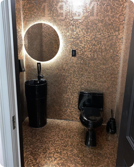 This unforgettable lobby bathroom is covered entirely from floor to ceiling in real pennies. Every wall. Every surface. Every inch. Thousands upon thousands of shiny copper pennies come together to create a jaw-dropping, fully functional restroom that instantly stops guests in their tracks. It’s bold, unexpected, and unlike anything you’ve ever seen in a hotel—or anywhere else.
